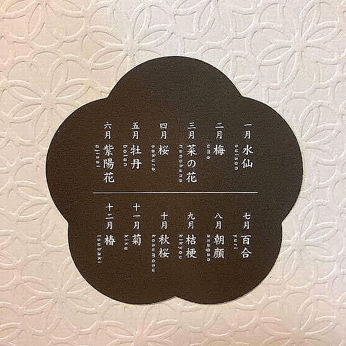 月花名:1月:水仙/2月:梅/3月:菜の花/4月:桜/5月:牡丹/6月:紫陽花/7月:百合/8月:朝顔/9月:桔梗/10月:秋桜/11月:菊/12月:椿